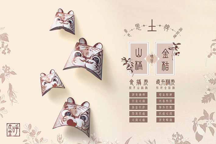 Do you know that a lot of candy on the market contain herbal ingredients? According to the Compendium of Matateria Medica and Five Elements, the brand classifies herbal sugars into several categories and connect with common modern life behaviors. The product is packed based on traditional Chinese medicine package which extends the outlook of Tiger Head Shaped Package. While consuming herbal sugar, people can not only gain the nutrition of its ingredients, but also experience the essence of traditional Chinese medical culture. In addition, consumers can scan the packaging to watch a series of AR animations and learn more about herbal sugar via cell phones!